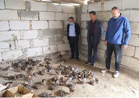 在阿依古丽•阿迪力家,驻村工作队干部帮助她修建鸡舍,安装投食器等设备。同时给她传授了养鸡注意事项、饮水温度、清舍消毒、疫病防治等方面的知识,以便提高鸡苗的成活率,为他们增收提供保障。