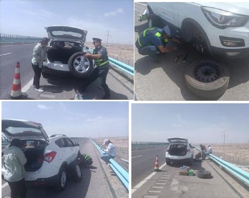 7月14日,温宿交通运输综合行政执法大队执法人员在巡查至G3012线K914+200米时,发现一辆白色轿车停靠在路边,无任何警示标志,驾驶员站在一旁焦急的打着电话,执法人员见状立即上前查看,经询问得知,车辆在行驶途中遭遇爆胎,因不会更换轮胎正在紧急求援。