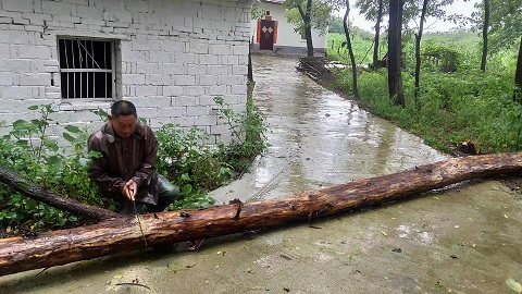 昨天夜晚突如其来的暴风雨袭击黄龙镇,为保障群众生产生活,及时解决这场暴风雨给群众带来的困难,该镇人大积极响应党委号召,各级人大代表主动作为,深入村组查看灾情,并走访贫困户。襄阳市人大代表、黄龙镇党委书记张君华、镇长刘帆、区人大代表、向湾村支部书记向志庆在深入弱势群众家中走访时,发现向湾村五组孤寡老人袁顺艮出行路上一棵大树横倒路上,影响老人出行,并存在安全隐患。张君华、刘帆当即要求村里立即安排人清理路障。向志庆叫来工人,当时正在下着小雨,在保证安全的前提下,向志庆与工人一起冒雨对倒在路上的大树进行截断、清运,及时疏通了袁顺艮老人门前道路,保障了老人出行安全。