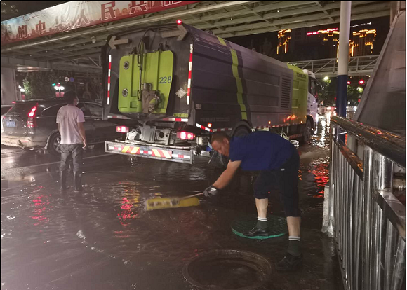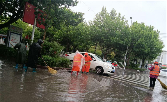 在市区大十字、东环立交桥、解放中路十字、以及步行街等附近,大量积水使整个路面变成了“小河”,执法局和旭辉愿景物业公司调动所有扫地王、吸水车、保洁车等车辆,奔赴积水现场清理作业。笔者看到几名执法局干部和环卫工人正在东环立交桥下积水处进行作业,他们的衣服淋湿了、鞋子在雨水里浸泡了几个小时,泥水溅到了他们的身上、脸上,但他们全然不顾、一丝不苟地清理着积水、淤泥,甚至有的额头上更是冒着满满的汗珠,鞋子变成了“泥鞋”,橘黄色的工作服变成了“泥服”。