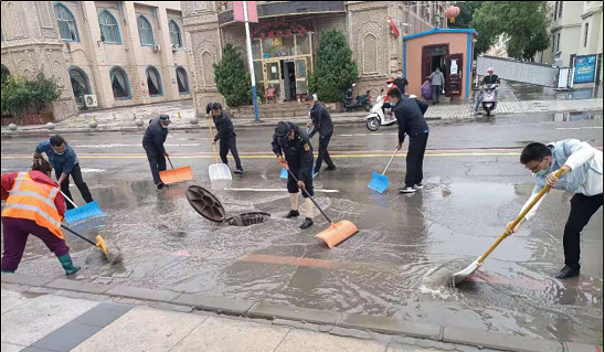 “这场突如其来的强降雨,使市区部分主次干道路面、人行道都出现大量积水和淤泥,严重影响了市民的出行,为了尽快恢复路面路况,及时清理积水及淤泥,让行人、车辆出行方便,我们的执法局干部和环卫工人纷纷走向街头对各辖区各路段展开清理积水、淤泥作业,力争在最短的时间内还市民一个清洁美丽的城市。”市执法局党委副书记、局长亚力昆·托合提说道。